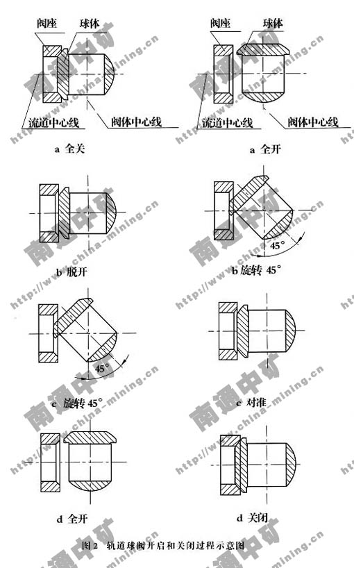 關(guān)閉時(shí),當(dāng)執(zhí)行機(jī)構(gòu)帶動(dòng)閥桿向下運(yùn)動(dòng),閥桿下移,并使球體開始旋轉(zhuǎn),閥桿繼續(xù)下移,閥桿受到嵌于螺旋槽內(nèi)的導(dǎo)向銷作用,使閥桿和球體同時(shí)旋轉(zhuǎn)90°,快要關(guān)閉時(shí),球體已在與閥座無接觸的情況下旋轉(zhuǎn)90°,閥桿繼續(xù)下移 ,球體擺動(dòng),并受機(jī)械楔緊施壓壓緊在閥座上,使閥座密封面產(chǎn)生彈性變形,與球體密封面緊密配合,從而保證安全、可靠的零泄漏。