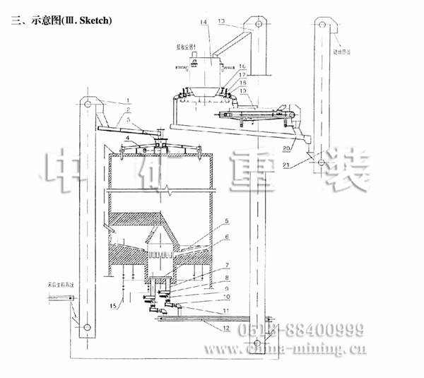 MF生料均化庫采用分配器和六根斜槽呈輻射狀卸入庫內(nèi),基本形成水平料層,庫底是錐形,略向中心頃斜,中部有一中心混合室,中心室與庫壁之間的庫底分為6-14個(gè)充氣區(qū),每區(qū)設(shè)3條充氣斜槽和1個(gè)卸料孔。卸料時(shí)向兩相對區(qū)輪流充氣,在卸料口上方出現(xiàn)多股漏斗凹陷,漏斗沿直徑排成一列,隨充氣的交換而旋轉(zhuǎn)角度,這樣不但產(chǎn)生重力混合,而且生料從庫底卸入中心室后,中心室底部連續(xù)充氣,使生料又獲一次均化,由于這種庫的均化原理是以料流漏斗重力混合為主要手段,所以電耗極省,能耗僅為0.432-0.576kwh/t,均化值可達(dá)7-10,該系統(tǒng)具有高效節(jié)能,基建投資低和操作管理簡便等優(yōu)點(diǎn)。