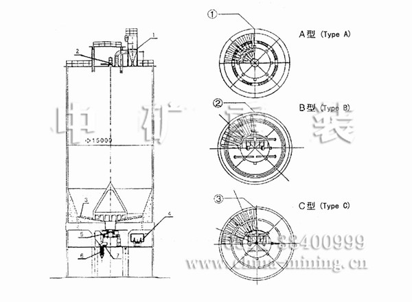 水泥儲(chǔ)存庫是在庫底中心位置設(shè)一錐形混合室,以降低庫內(nèi)的卸料壓力,消除漏斗流?;旌鲜?設(shè)8~12個(gè)進(jìn)料孔,在混合室和庫壁之間的環(huán)形區(qū)設(shè)有8~12個(gè)充氣區(qū),卸料時(shí)輪流向相對(duì)的環(huán)形小 區(qū)充氣,使部分水泥流向中心混合室。在自上而下的流動(dòng)過程中,切割水平料層而產(chǎn)生重力混合作 用,進(jìn)入混合室后又因混合室內(nèi)的連續(xù)充氣攪拌而進(jìn)一步均化。這種庫的均化值可達(dá)5~9。電耗 0.15~0. 30kwh / t.