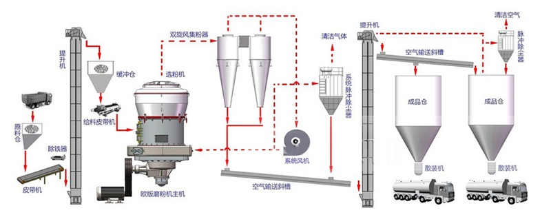 原料從儲(chǔ)倉(cāng)落入到計(jì)量皮帶機(jī)上,通過(guò)自卸式除鐵器除鐵后進(jìn)入歐版磨進(jìn)行粉磨,粉磨后的物料經(jīng)過(guò)風(fēng)力作用通過(guò)選粉機(jī)進(jìn)行分選,選出符合要求的成品粉,通過(guò)旋風(fēng)收集器進(jìn)行收集暫存。