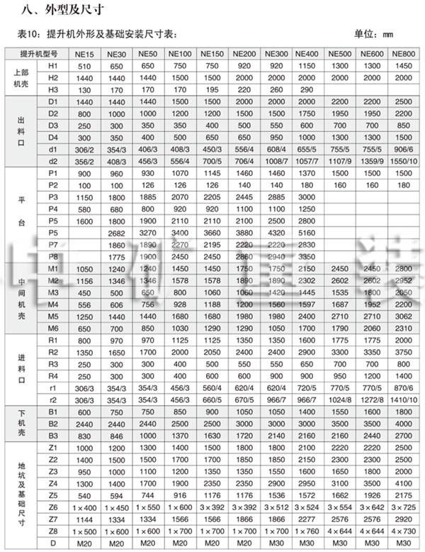 NE15、NE30、NE50、NE100、NE150、NE200、NE300、NE400型提升機的提升量、提升高度及動力配備表見表2-9,選擇NE500、NE600、NE800型提升機時,請與中礦公司技術部聯(lián)系,聯(lián)系人:周小姐,聯(lián)系電話:0513-88400999。
