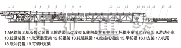 落地側(cè)裝式鋼架為機身,上托輥組間距為1 2或1 5米,下托輥組間距為3米。托輥組設(shè)有前后調(diào)整位置,通過調(diào)整托輥組位置來調(diào)整輸送帶的跑偏。托輥均采用沖壓軸承座托輥,設(shè)有雙重密封,具有重量輕、密封性能好、旋轉(zhuǎn)阻力小、使用壽命長等特點。