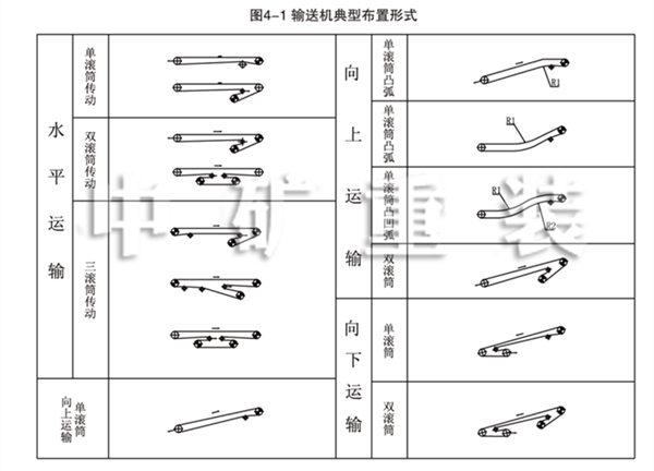 4-1、帶式輸送機(jī)可以用于水平或者傾斜輸送,可以?xún)A斜向上,也可以?xún)A斜向下,其典型布置形式參照?qǐng)D4-1。
